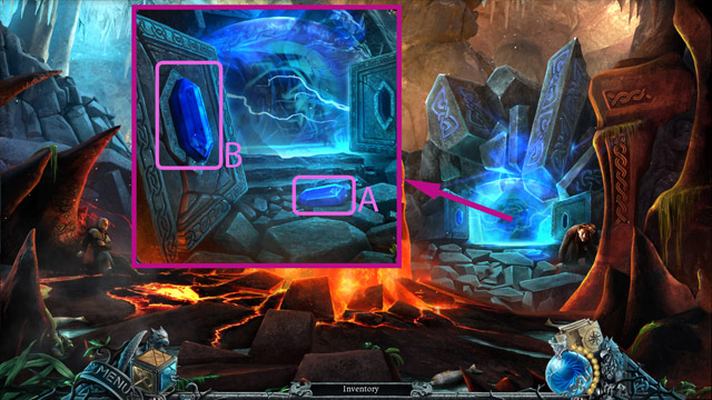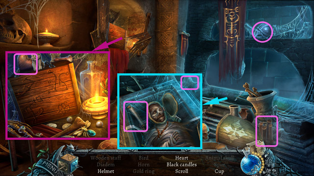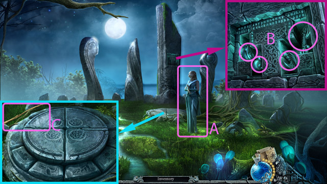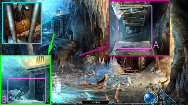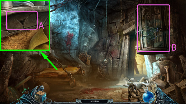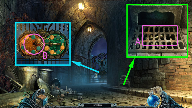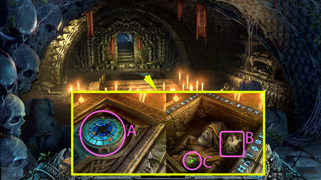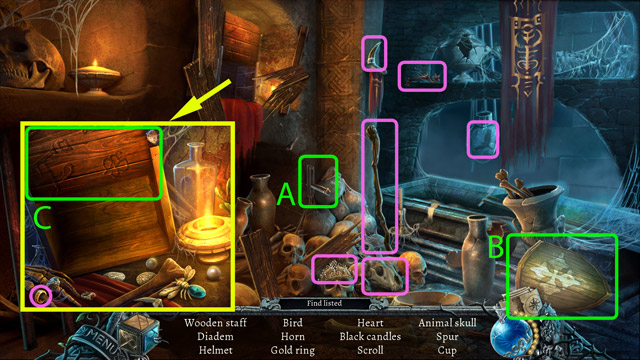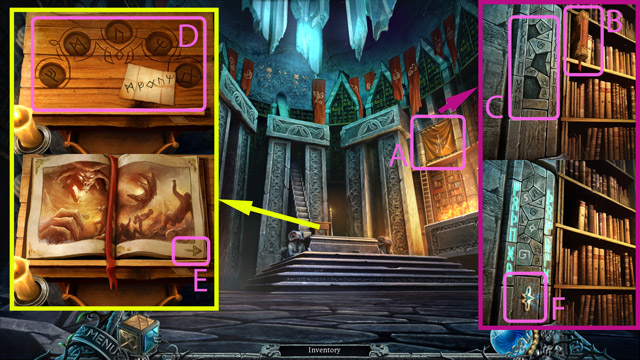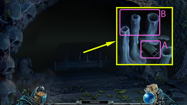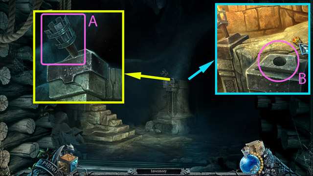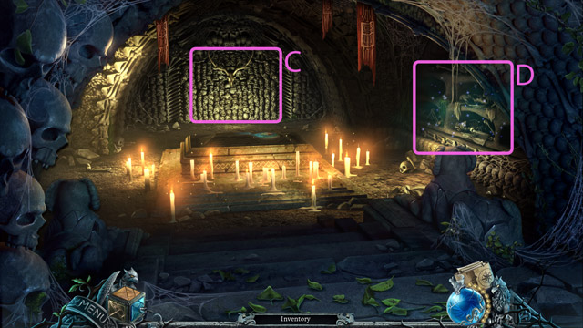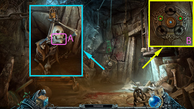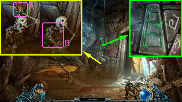 • Insert the First horn and the Second horn into the skull on the wall (B)