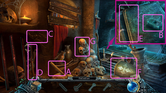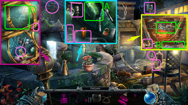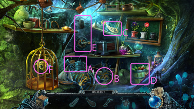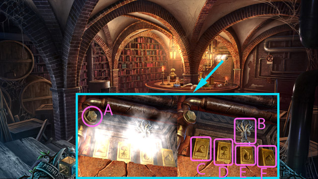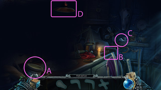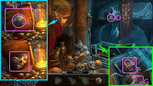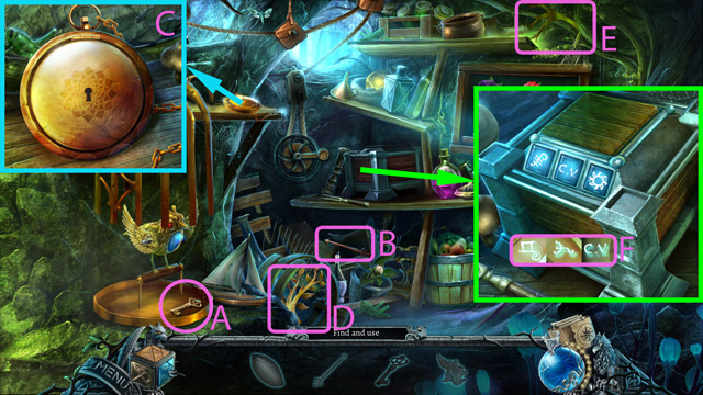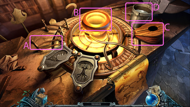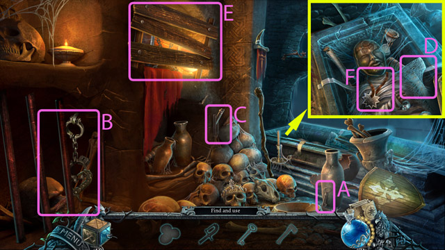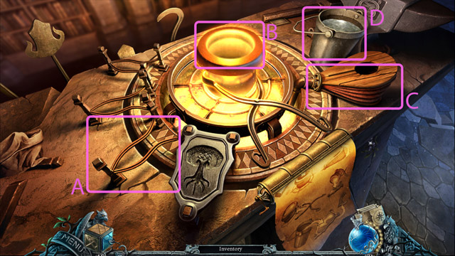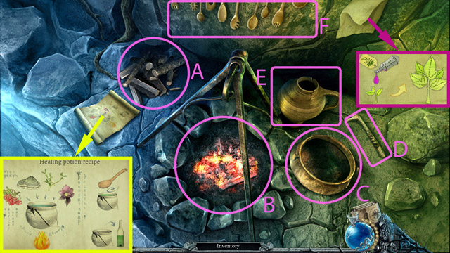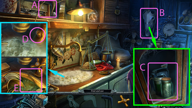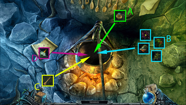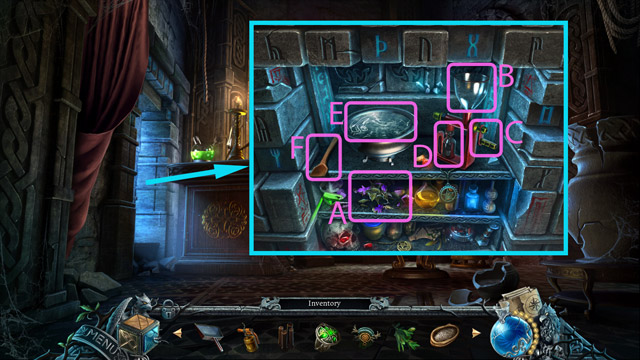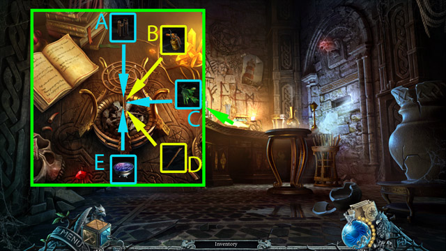 • Add the following ingredients to the pot (E): the Relic powder, the Pan with the ash, the Blood in the tube and the Vervain oil.