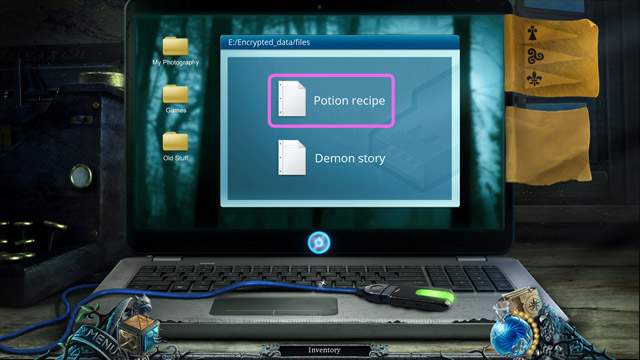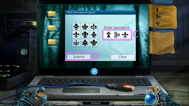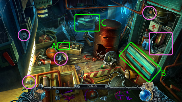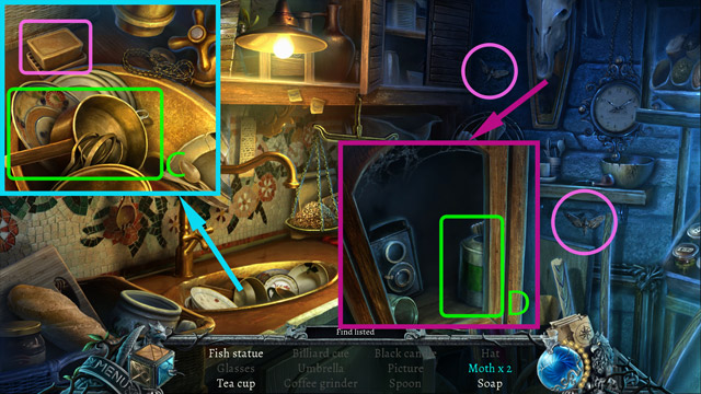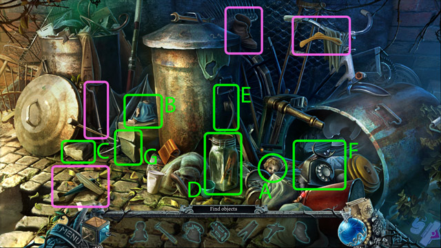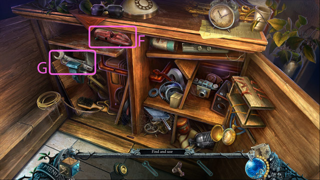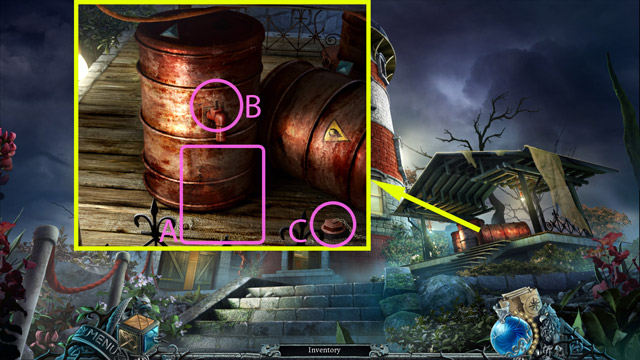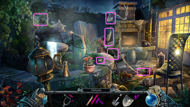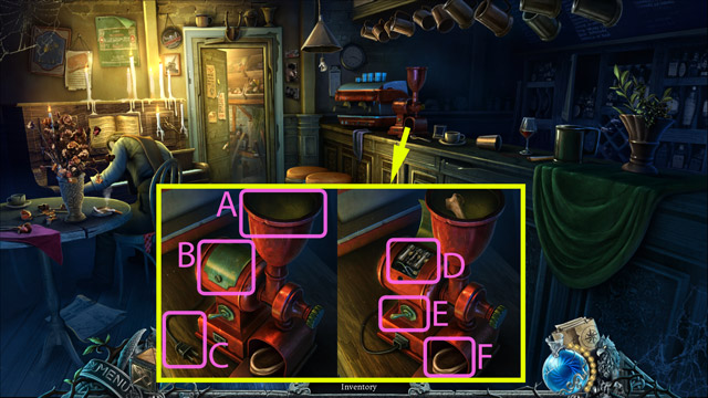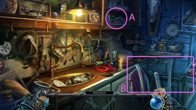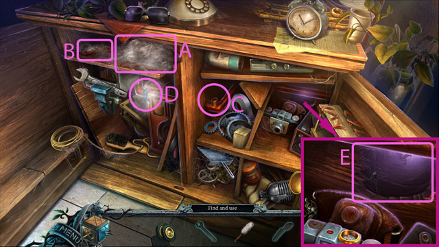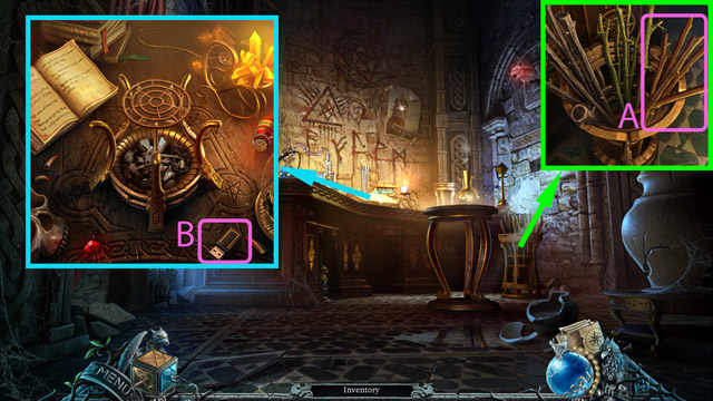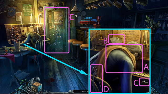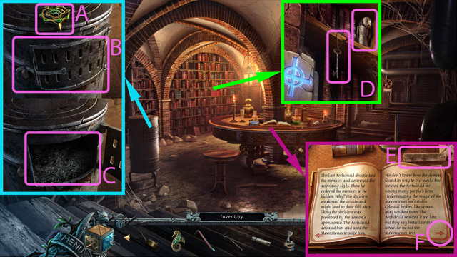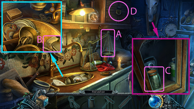 • Add the following ingredients to the pot (E): the Relic powder, the Pan with the ash, the Blood in the tube and the Vervain oil.