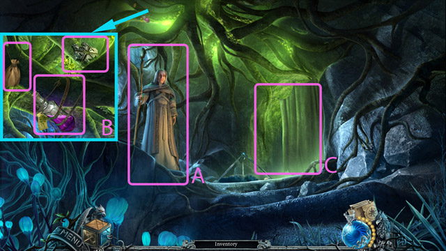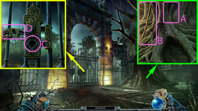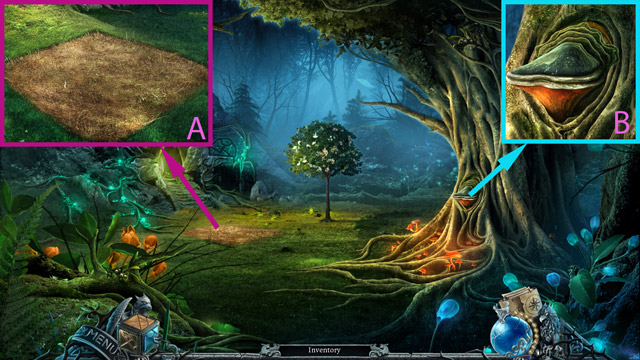 • Dig a hole with the Spade under the tree (A). Important: make sure you've read the scroll at the archdruid's coffin, 4 steps above, otherwise the action will be not available.