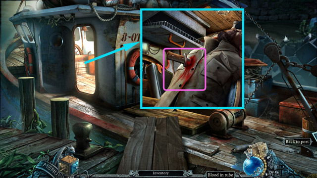 • Go to the boat and use the Test tube on the blood to get the Blood in the tube.