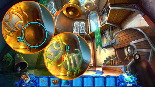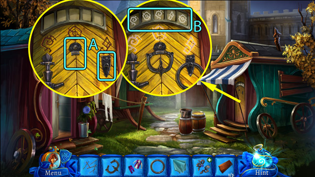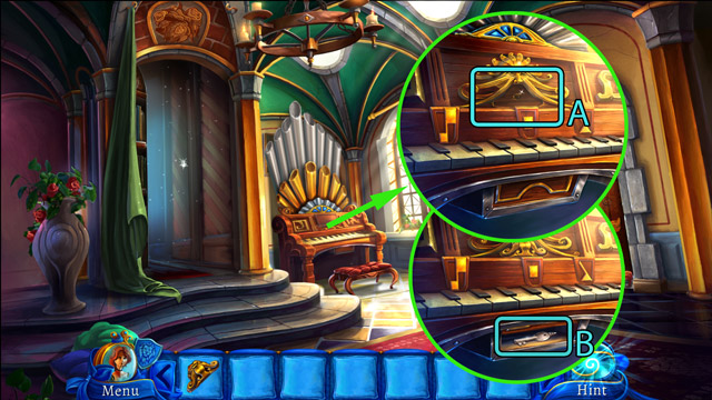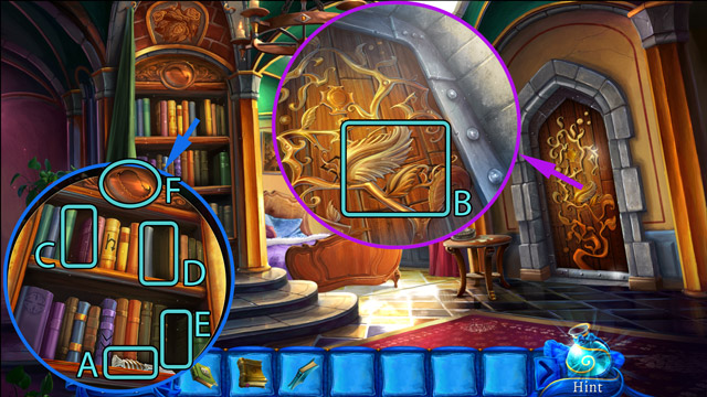 - Using the Paper knife break off the decorations on the door (B). You will get the Ornamental leaf. Also, note the signs engraved in the wood. It hints the proper order of the books on the shelves.