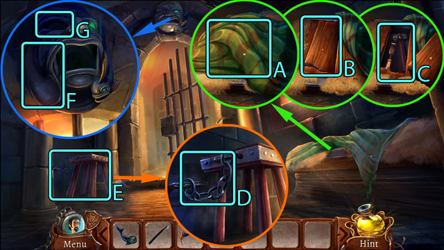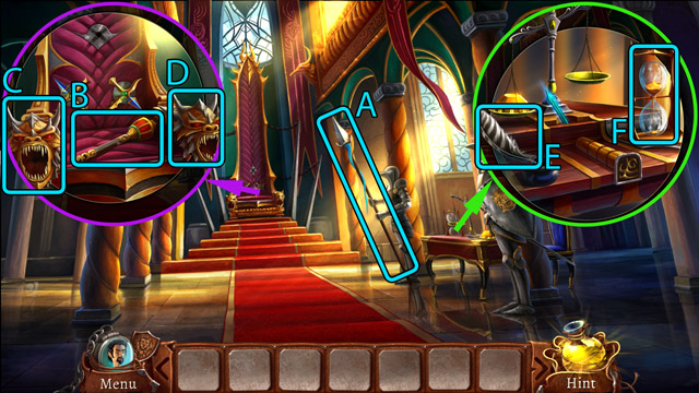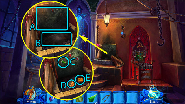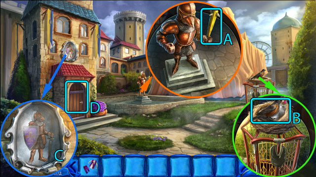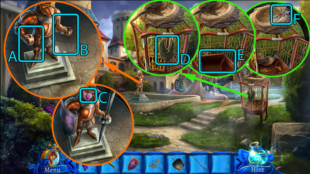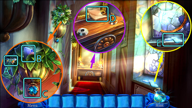 - Pick up the Knight figurine (B) and the fourth Piece of stained glass (C).