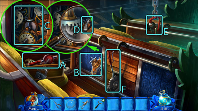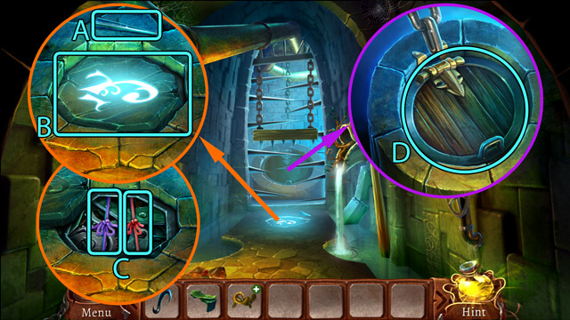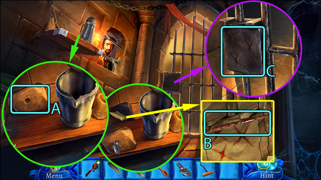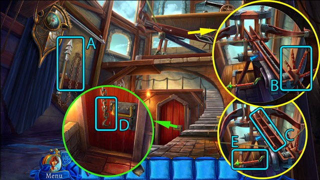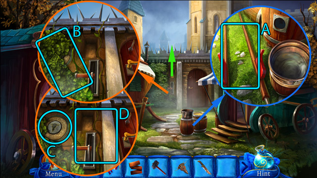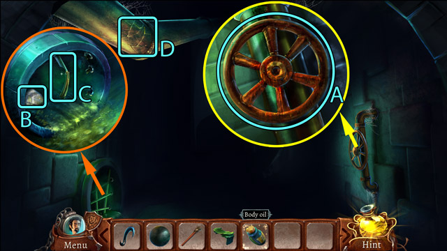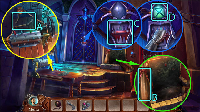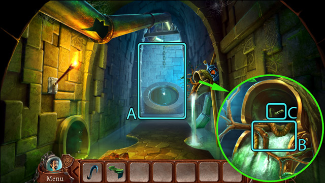 - Look at the pipe with protruding branches. Pick up the Piece of rope (B) and pull the small lever (C).