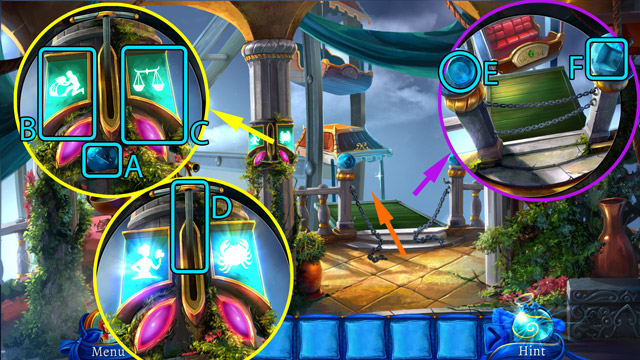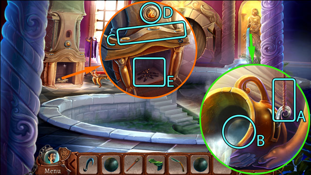 - Use the Piece of mosaic on the broken mosaic (C) and play the minigame. After that, go down the secret passage at the bottom of the pool.