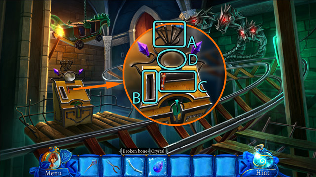 - Pick up the Broken bone (A) and the Crystal (B).