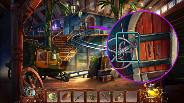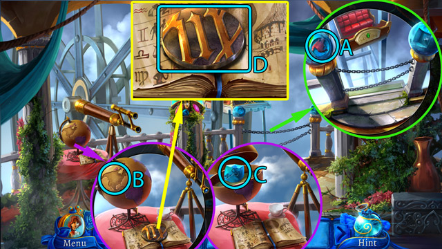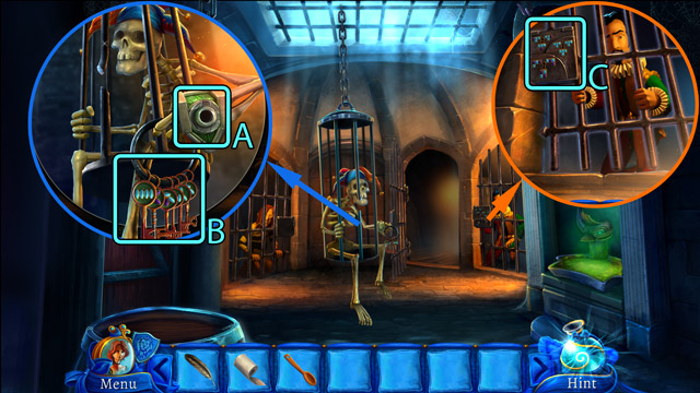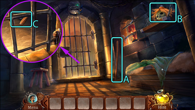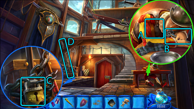 - Open the padlock (C) with the Hair pin.