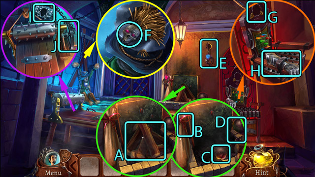 - Extinguish the fire in the fireplace (D) with the Jug with water. Then pick up the cooled down Poker.