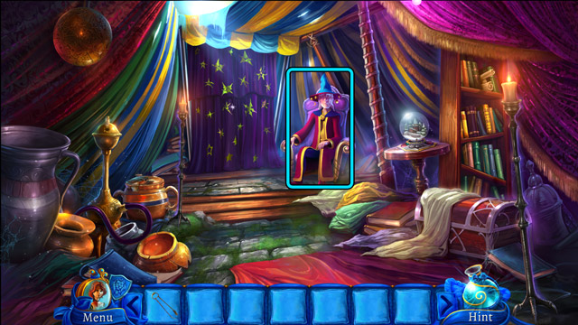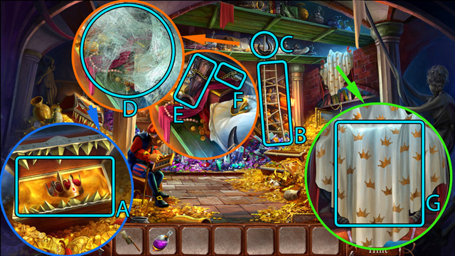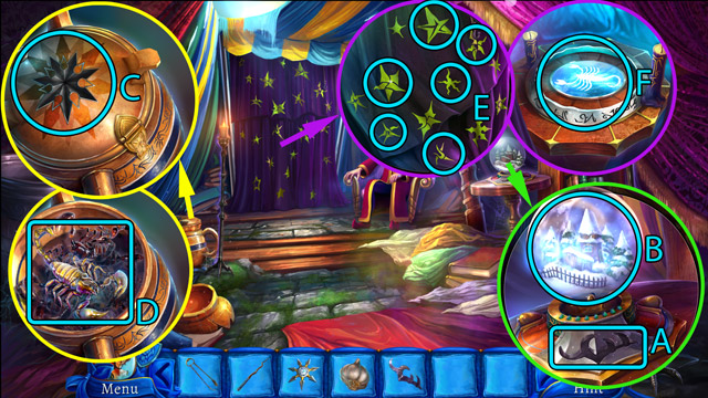 - Place the Scorpion and the Garlic on the magic table (F) and use the Magic wand on them. Then pick up the Pill of happiness.