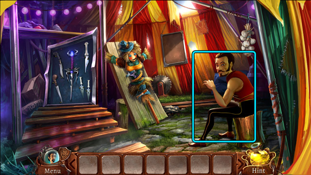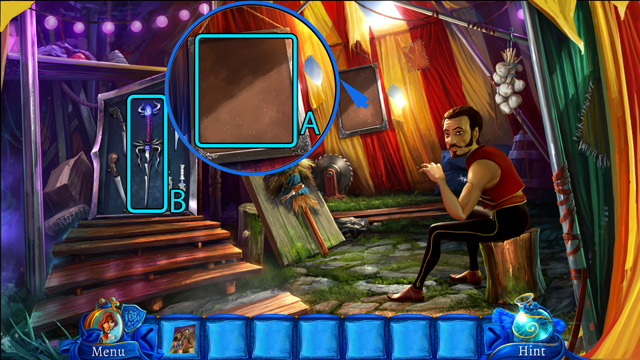 - After dialogue with the Knife Thrower pick one Blunt knife from his set of knives (A).